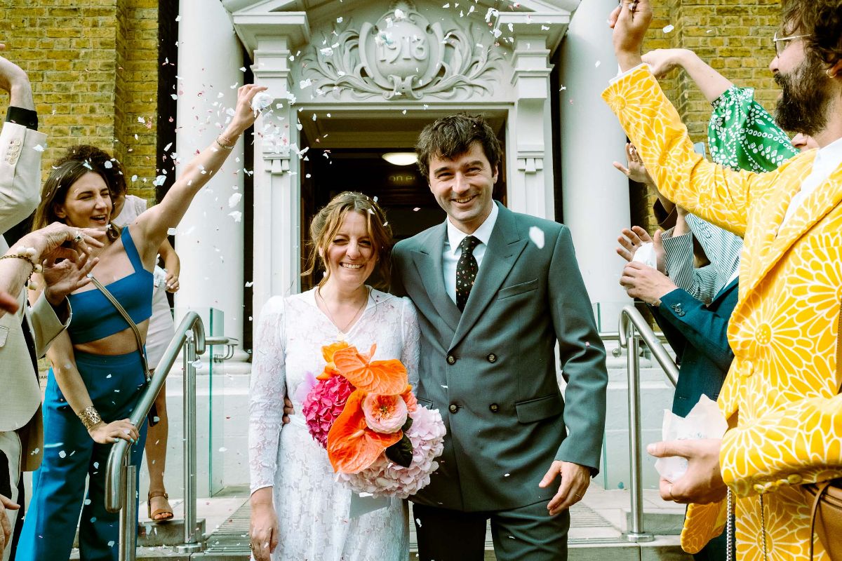 Sara & Quentin had a small, intimate ceremony at the Town Hall in Maida Vale, London. Sara chose a simple, timeless dress from our shop to go with the venue & unaffected style of their wedding. It was a 1940s all floral lace wedding gown with long sleeves and a-line skirt.