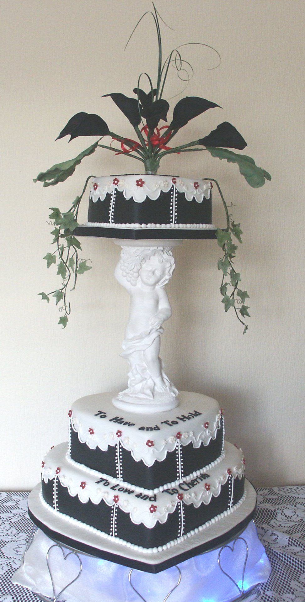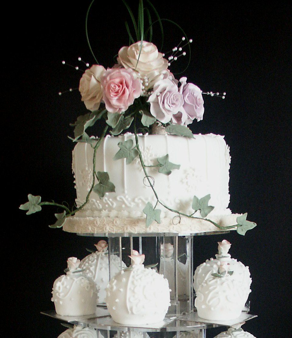 So once you have established approximate portions and cake sizes needed, the number of tiers, cake flavour, there is a link to take you to the basic cost of each cake. Costs increase consistent with the luxury, decoration, or items such as wired sugar flowers, cake toppers, cake stand hire, internal supports for stacked cakes, drapes, frills, and other embellishments.