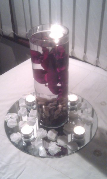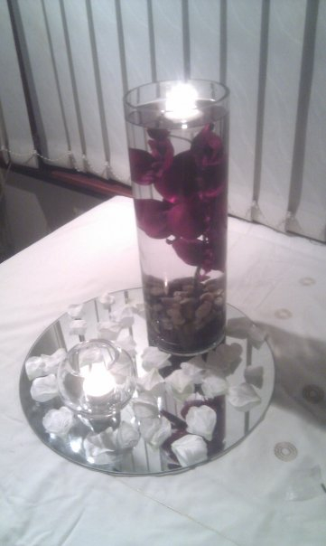 Hi guys, we have spent tonight making sample centrepieces. We are doing our own on a budget, so they are quite simple, an artificial flower in a vase of water, grounded by decorative stones with a floating candle, set on a mirror with petals and tea lights. Our colours are ivory and aubergine, can you tell me which one you prefer, the cream rose with one tea light, the purple rose with one tea light or the purple rose with 4 tealights around it? Thanks in advance x