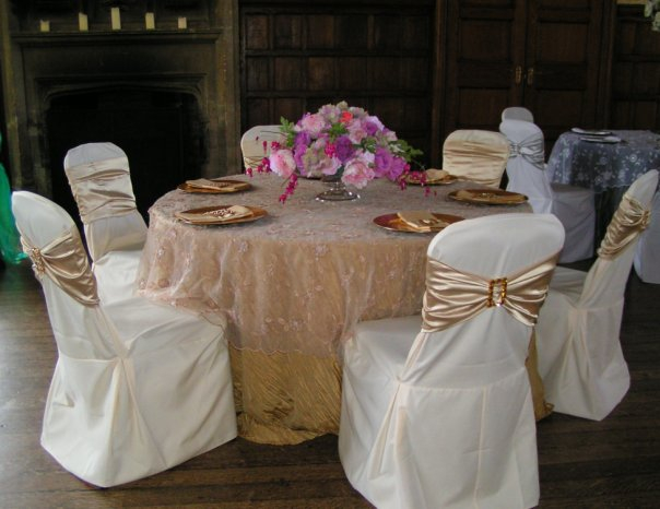 what about champagne taffita whith mathing table runners???? instead of organza or satin like ( but obv not in a bow