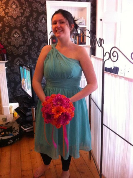 the dress is gorgeous....Love the colour, and the colour flowers your bridesmaid is holding goes lovely with it....