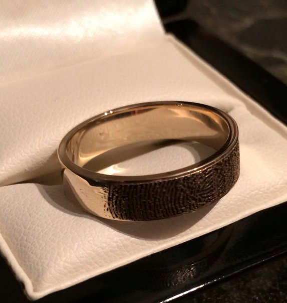 My dad left me a ring when he passed away and it's been sat in a box for 13 years. H2b asked if we could have it melted down and made into his ring. So we did, here's before and after pics (we've had my fingerprint engraved on it):