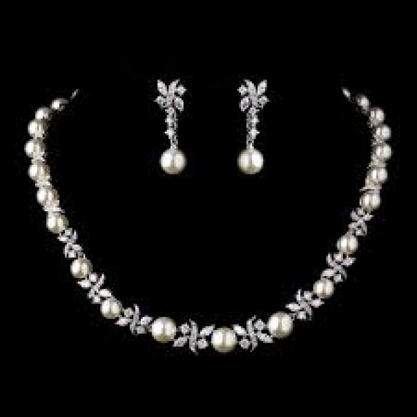 Depends on what look you want, have you got a tiara?? I matched mine with my tiara, I went bling rather than pearls, but if you wanted something subtle pearls would be good.