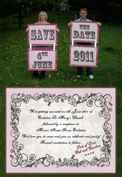 So I was slightly procrastinating from doing my uni work the day before yesterday, and I use Photoshop alot on my course (I'm doing photography) so using that, I managed to throw a few ideas around for some handmade save the dates! Printed a few out, stuck some bits together and so on and BAM!, showed h2b, mum and a few friends and they love them! :) So happy we've got another thing out the way, just need to get the girls round to help me print and stick 75 now!! Was also thinking of maybe sticking a tiny magnet in each little one so people can stick them up on their fridges hehe! Will put the piccie on wall soon :)