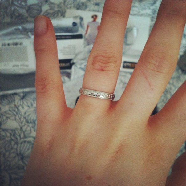 My engagement ring, a bit simpler than most but I love it, and it has a little heart cut out under the diamond. xx